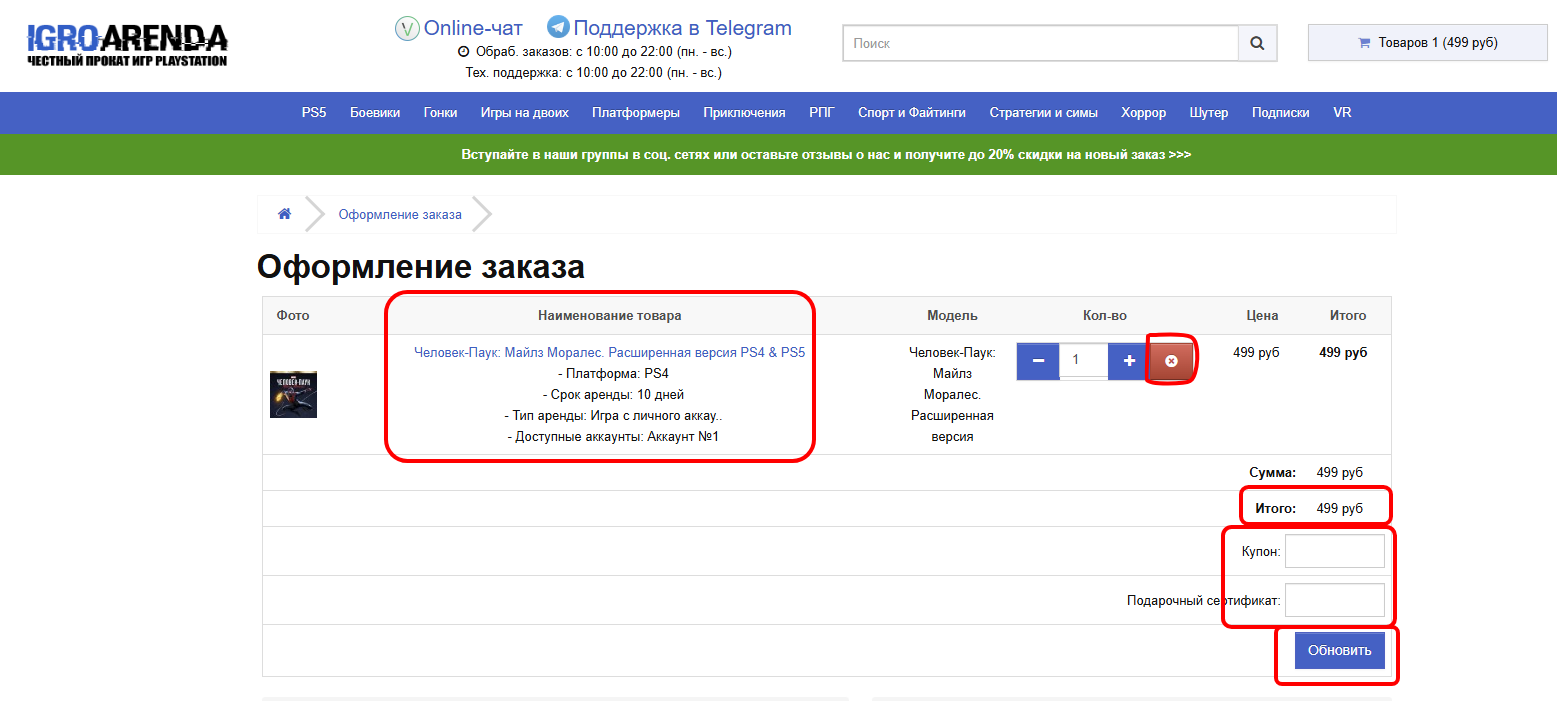 На верхней части страницы находится Корзина, где вы можете посмотреть список арендуемых игр, общую сумму заказа, удалить ненужные игры, ввести Подарочный сертификат или Код купона на скидку (выдается за раннюю сдачу, за отзыв и т.д.).