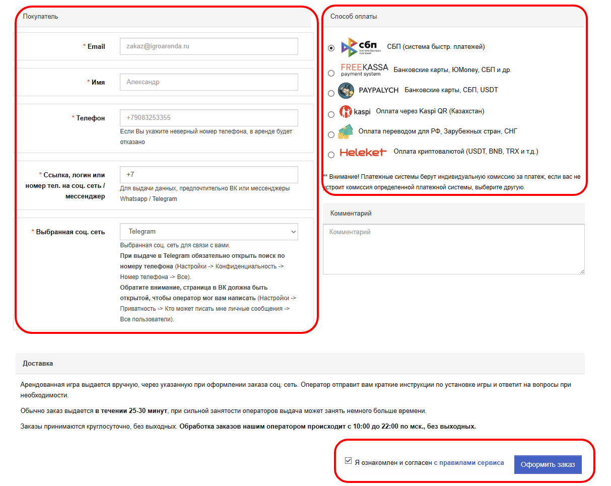 Далее перематываем в нижнюю часть сайта и в разделе Покупатель заполняем необходимые поля как указано на картинке, выбираем способ оплаты одним из предложенных вариантов, соглашаемся с правилами аренды и нажимаем кнопку Оформить заказ