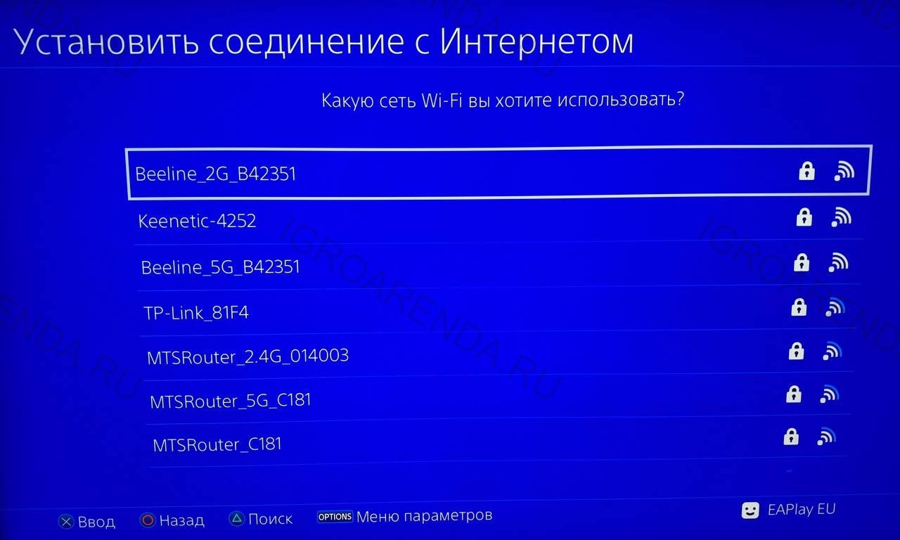 3. Из списка предложенных сетей выбираем вашу и нажимаем Options на геймпаде (находится справа от тачпада и имеет рисунок в виде трех горизонтальных полос).